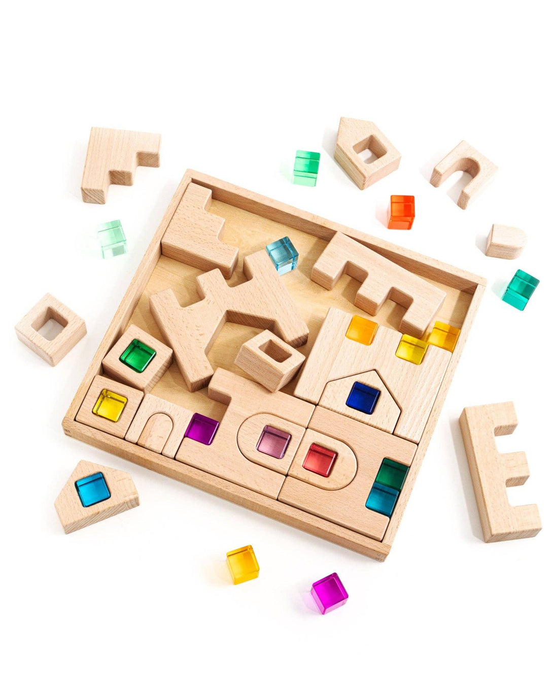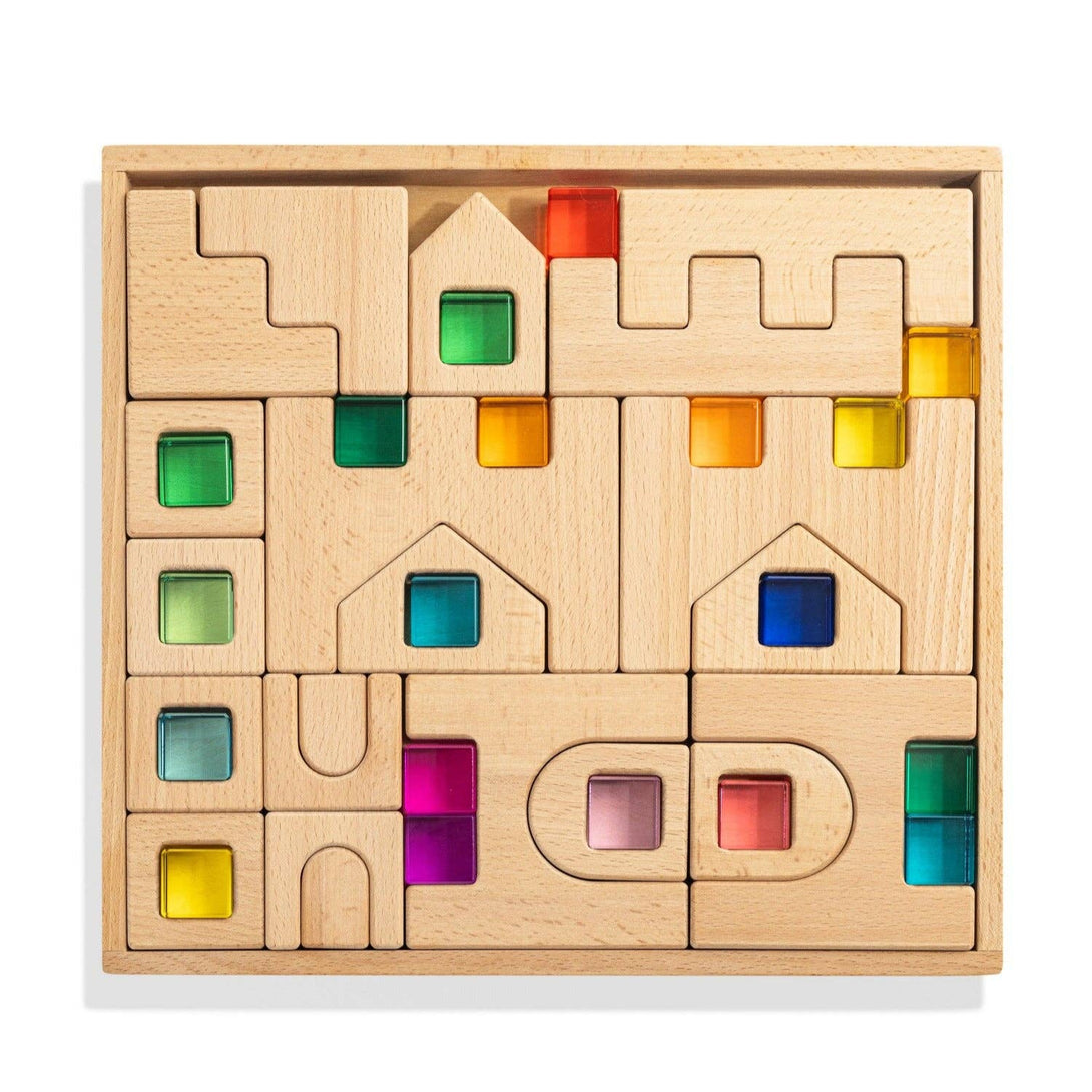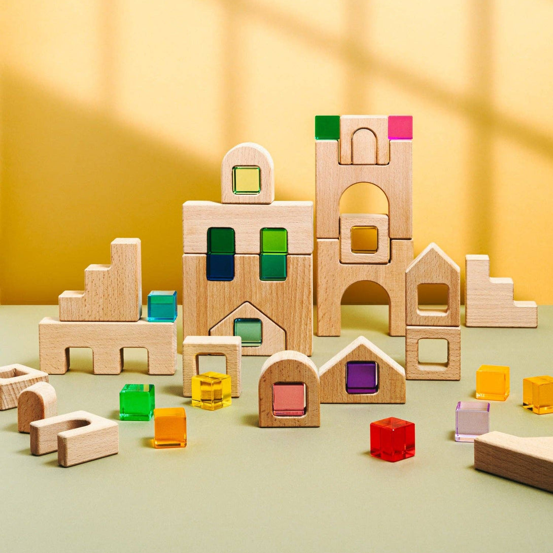 Step into the vibrant city of Barca! These blocks are a must-have for aspiring artists and architects. With this set of high-quality beech wood blocks, you can construct geometric buildings that are enhanced by colorful translucent windows. Delve into the mesmerizing world of light and color as you shine a light through the windows, or hold them up to natural light to see the beautiful shadows they create. Our Barca blocks ignite creativity and critical thinking. They can be used for STEM education or simply for open-ended play. These blocks also improve hand-eye coordination and fine-motor skills as children place the lucite cubes within the window frames. Suitable for ages 3 and up, our Barca blocks are perfect for homes, schools, and daycare centers.
