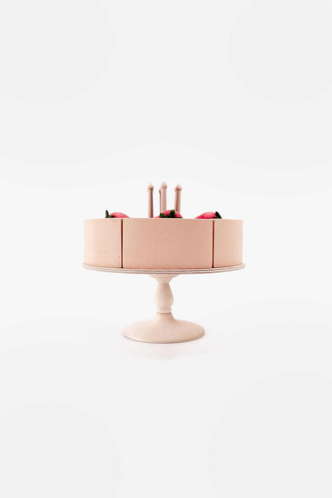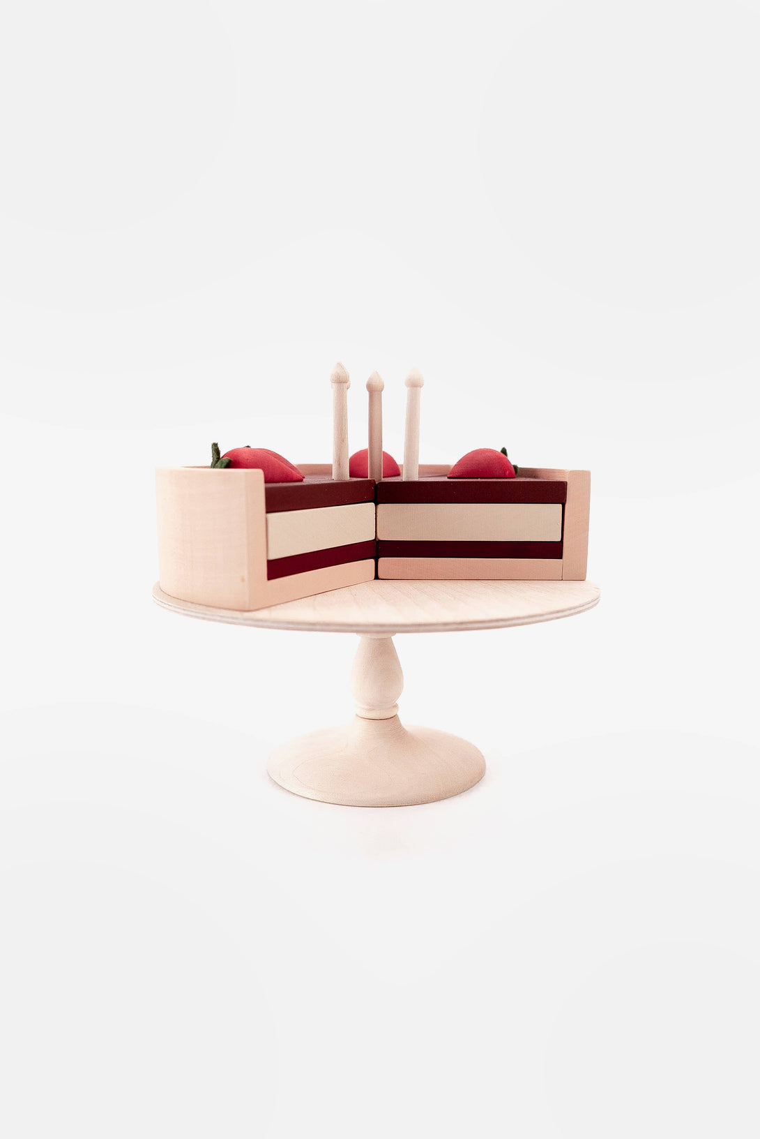 The set includes a stand, 6 pieces of cake, 6 candles, 6 strawberries halves