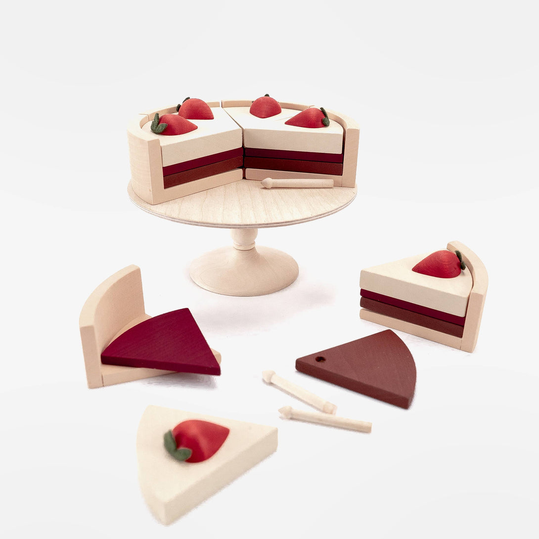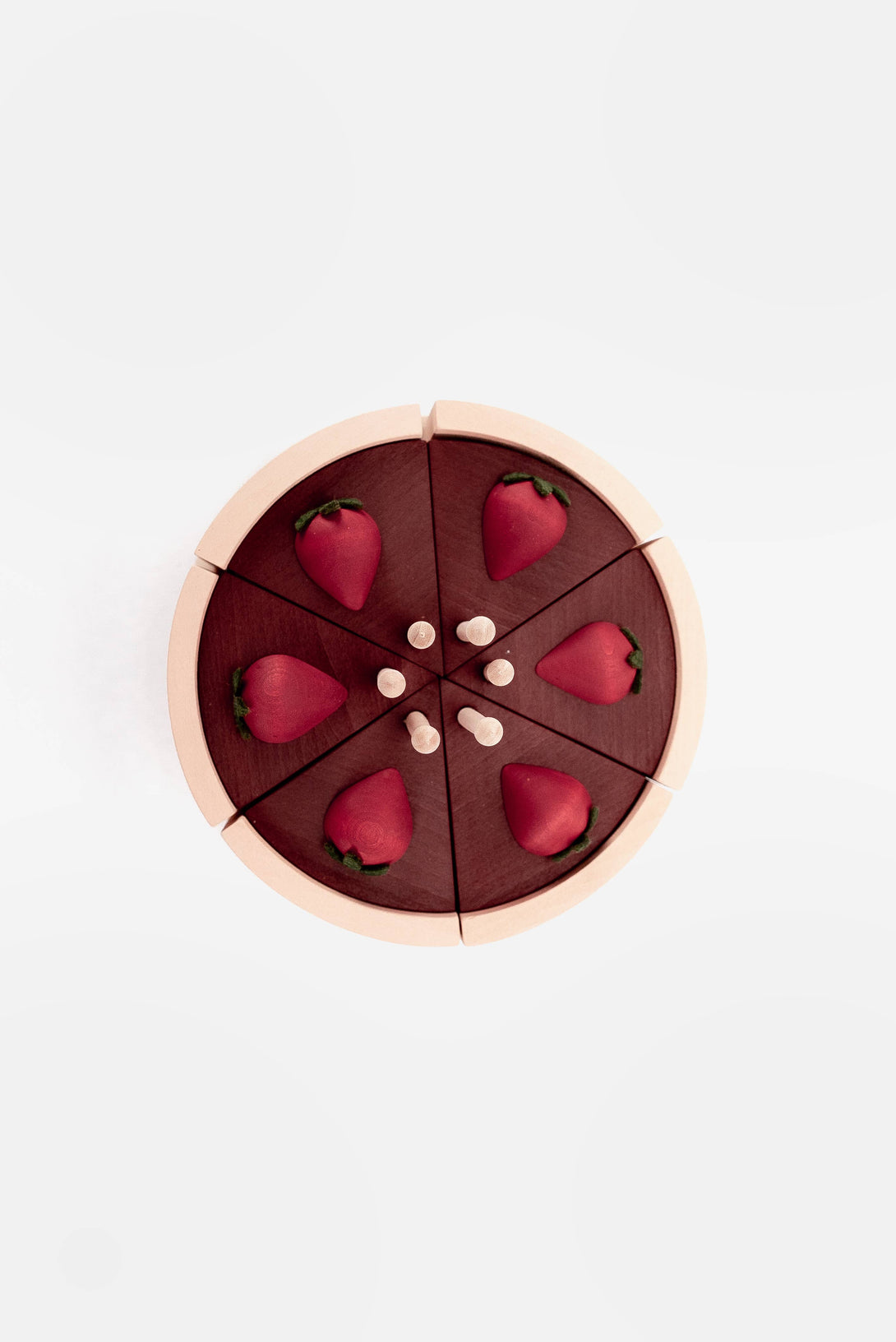 Each piece consists of a base and a side + three separate layers. They can be changed among themselves, so that the child can choose the order of the layers. This way, the child can make 3 different cakes.