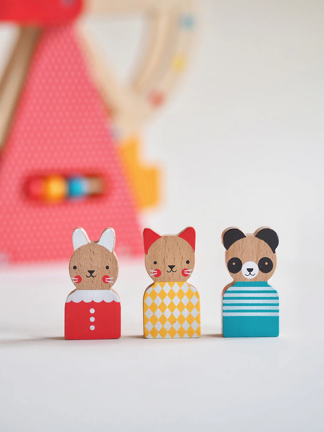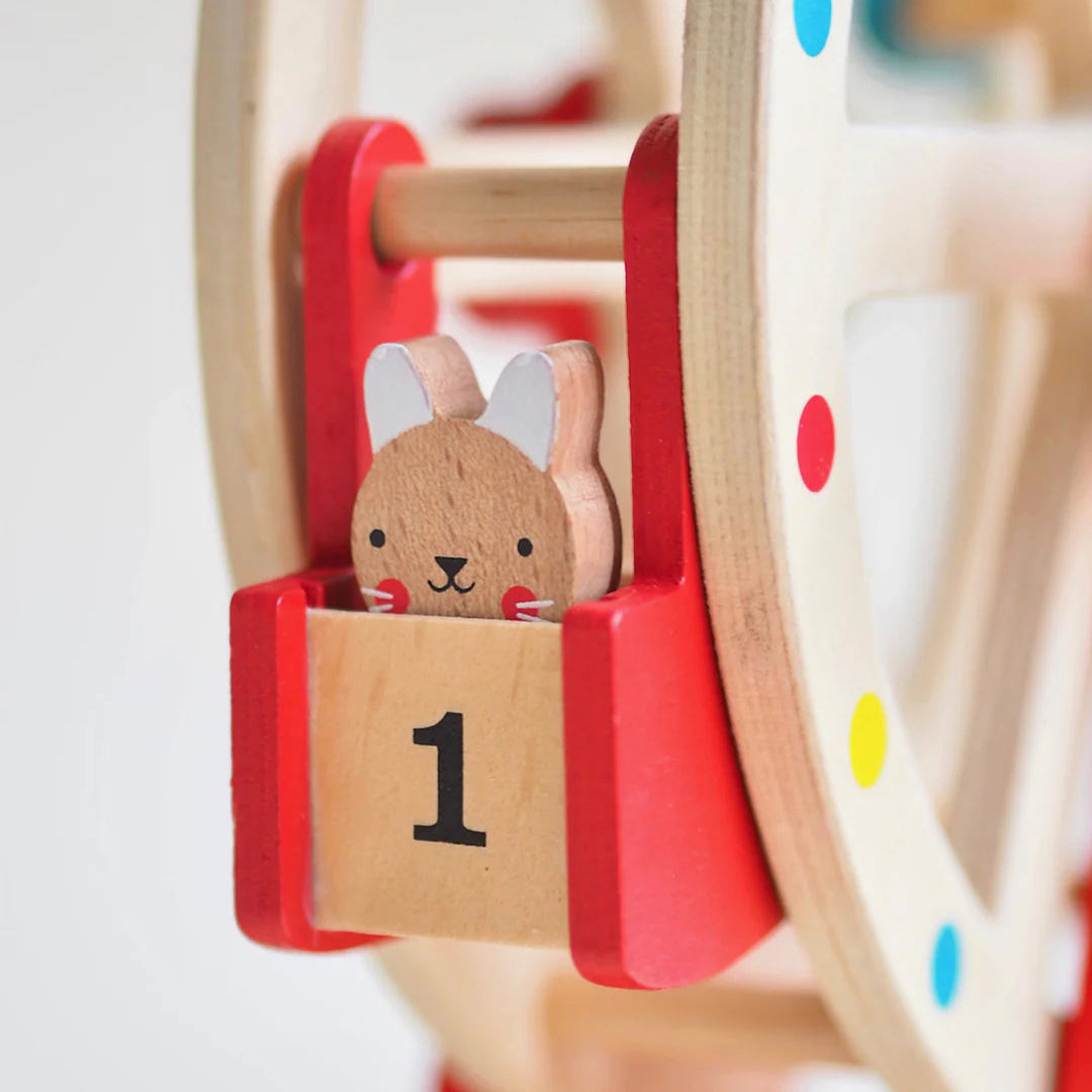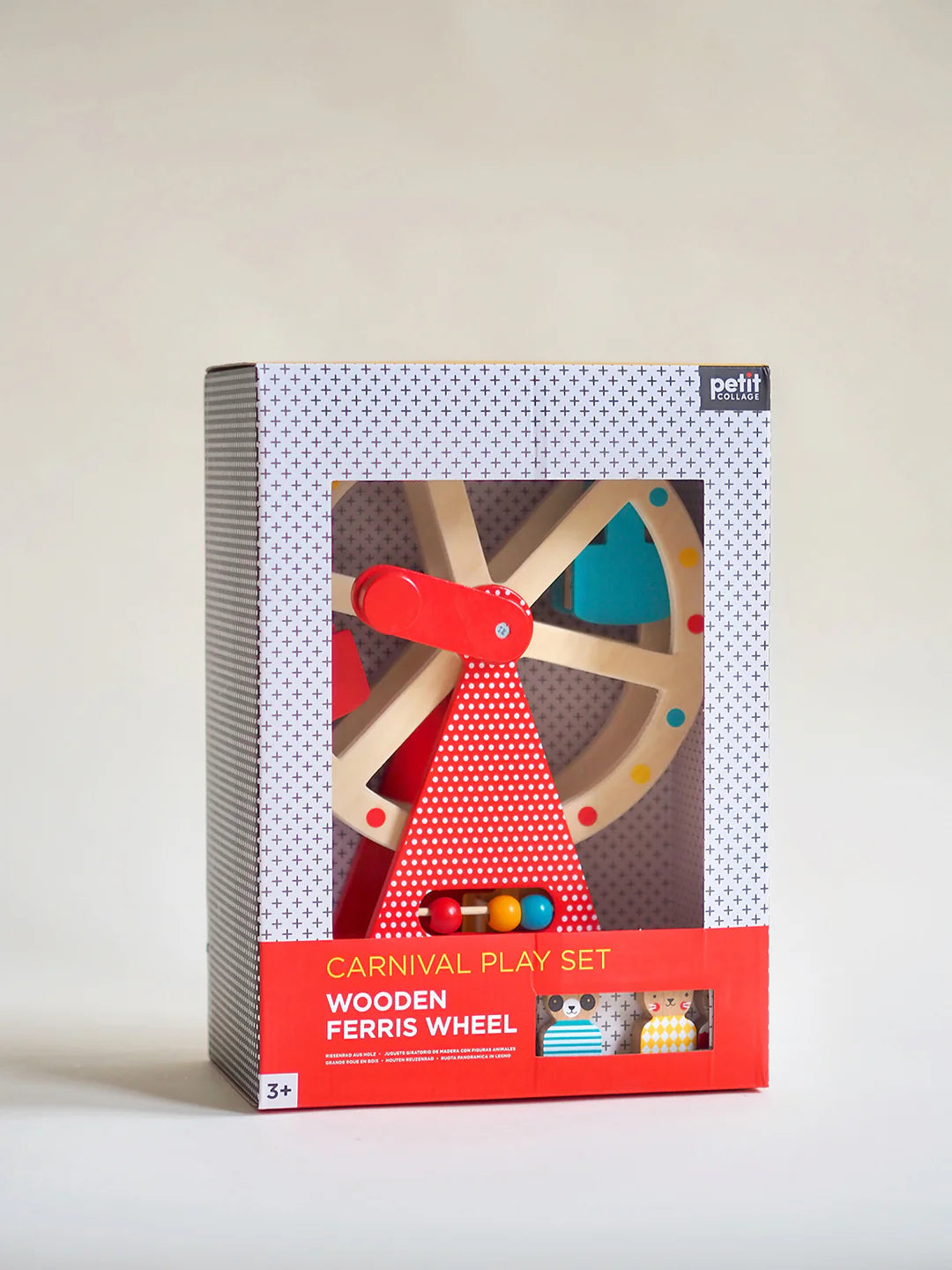 Turn the handle and watch this big wheel SPIN! Our pre-assembled and beautifully constructed Wooden Ferris Wheel comes complete with a crank handle to make it spin. Each playset contains three sweet solid beechwood animal friends that can be used in or out of the Ferris Wheel carriages. Sturdy wood construction printed with non-toxic water-based paints makes this stylish set perfect for play and display. Designed for ages 3 years and up.