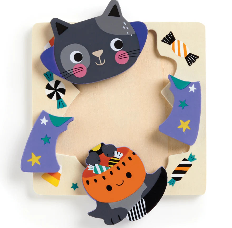 SET OF 4 WOODEN PUZZLES - Introducing our new 4 wooden puzzle set featuring adorable creatures and furry friends getting ready to celebrate the Halloween season and all its fun traditions. Each puzzle is made up of 4 wooden pieces that come together to form a cute spooky character that fits into a tray base. This puzzle is perfect for keeping little ones entertained while traveling or out and about.