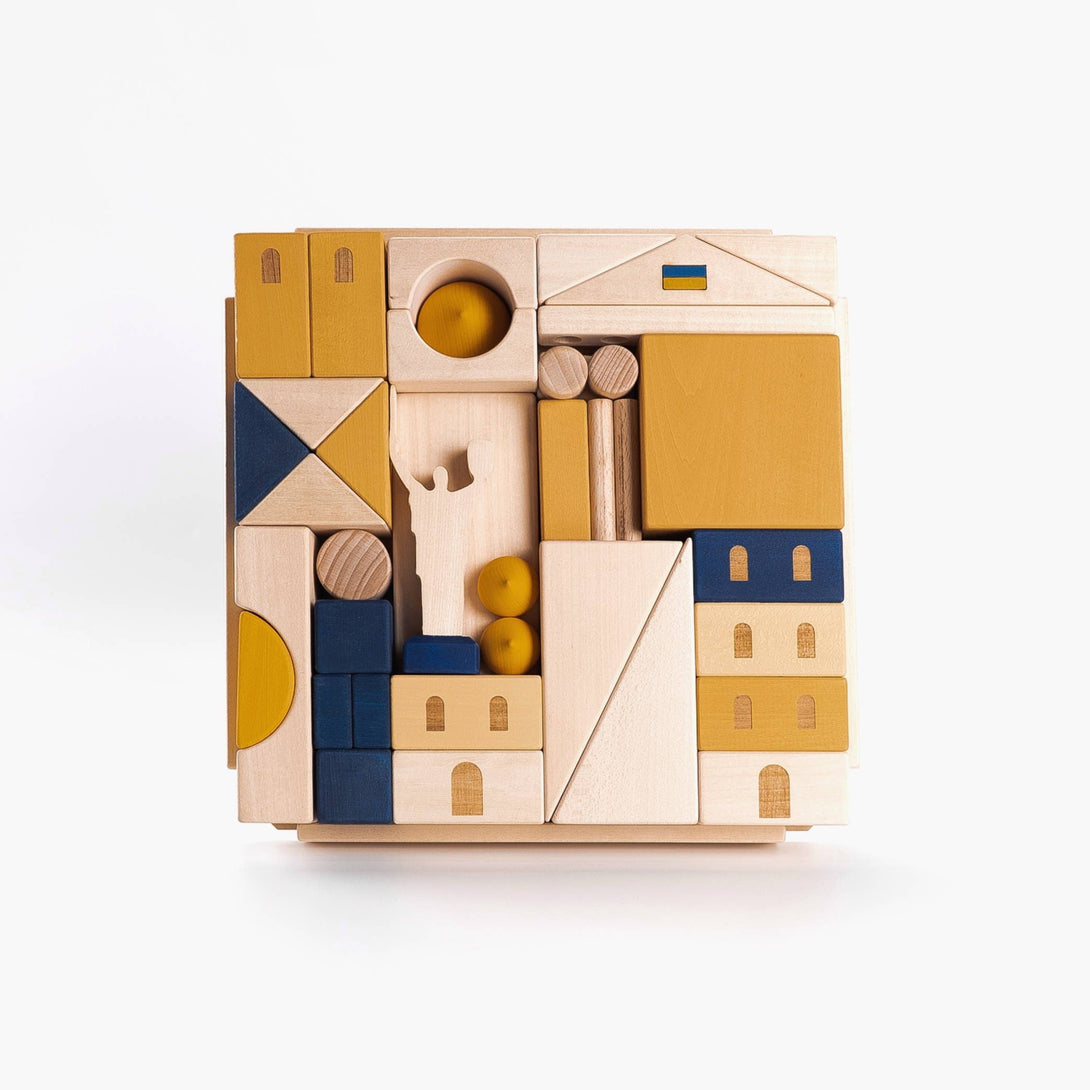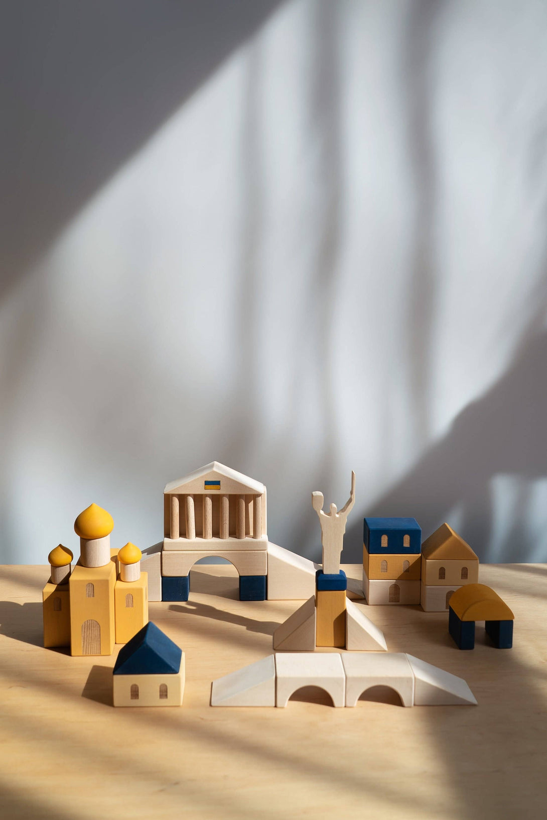 Theater in Mariupol. Bridges in Kyiv. Churches. Houses that were homes to millions of Ukrainians. Everything destroyed. Devastated lives, broken hearts and lost hopes. Being overwhelmed with the pain, we have embodied it in this set. For us these buildings are very symbolic and real. We see all destroyed cities in them that flourished before the war came to our land. But for your child – this can be your own beautiful town, as you can find these buildings in any city in the world. And each one has its own meaning: