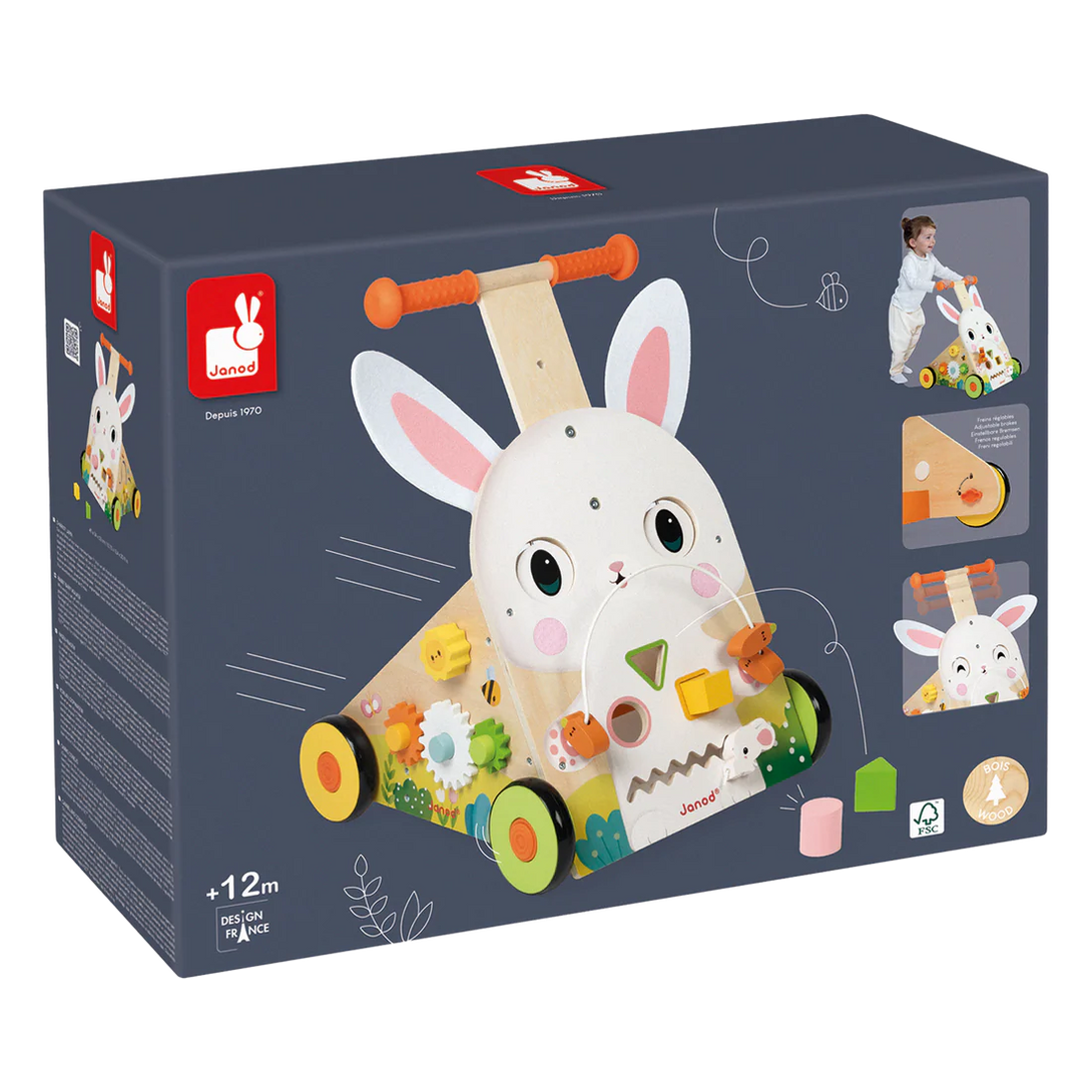 The Janod Wooden Rabbit Activity Walker is a multi-functional toy designed for children aged 12 months and up. This charming rabbit-themed walker offers 9 interactive activities across three sides, including a looping circuit with carrots, a traditional shape sorter, a sliding mouse in a labyrinth, a bee maze, gears, and a sound-producing sun. Its adjustable handle (46–53 cm) and brake system allow for tailored support as children learn to walk. Crafted from FSC-certified wood, it features tactile elements like felt ears and cheeks, and its rotating eyes add to the sensory experience. This walker promotes the development of fine motor skills, dexterity, and spatial awareness.