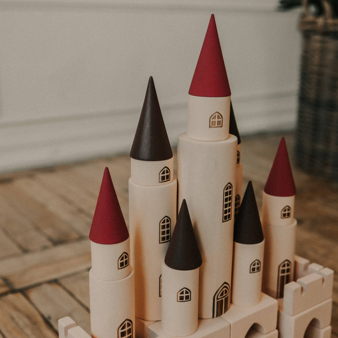 The constructor consists of 65 parts. In the set you will find 12 cylinders of different sizes, 7 cones of two sizes and different plates, blocks and arches. Each cylinder has an engraved window and/or door. Cones come in two sizes: three larger and 4 smaller. The set also includes 8 plates 2,36*5,9*0,6 inches (6*15*1.5 cm), 8 plates 1,57*3,54*0,6 inches (4*9*1.5 cm) in size; two long arches, a pair of stairs, 8 arches with a triangular cutout, 4 blocks 2,36*2,36*1,57 inches (6*6*4 cm), 6 blocks 2,36*1,57*1,18 inches (6*4*3 cm) and 8 double flat parts with two slots, measuring 2,36*1,18*0,39 inches (6*3*1 cm).