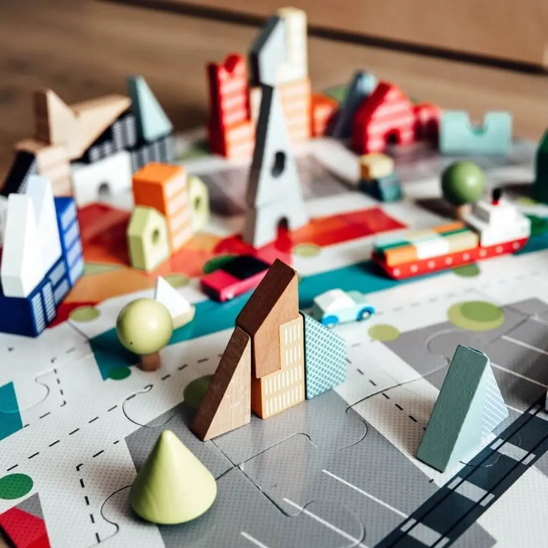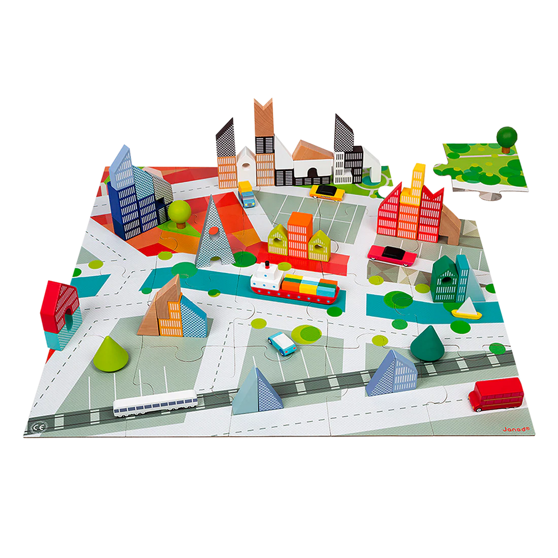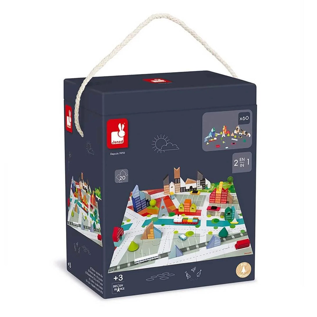 Calling all aspiring architects! It's time to bring the world's coolest city to life - yours! With this 2-in-1 game made of wood and cardboard, it's easy to build your own little world, full of cars and trains! Once you've put the 20-piece city puzzle together it doubles as a play mat (60 x 60 cm). Children can then arrange the 60 blocks representing buildings and vehicles any way they like. The game pieces are made of solid wood and painted using water-based paint. They open up a huge range of possibilities for aspiring designers: cities, towers, landscapes - you name it, you can build it! The practical barrel is great for storing the pieces, and it can be easily transported using its handle. This game is perfect for developing hand/eye coordination and spatial awareness. Perfect for children aged 3 and over.