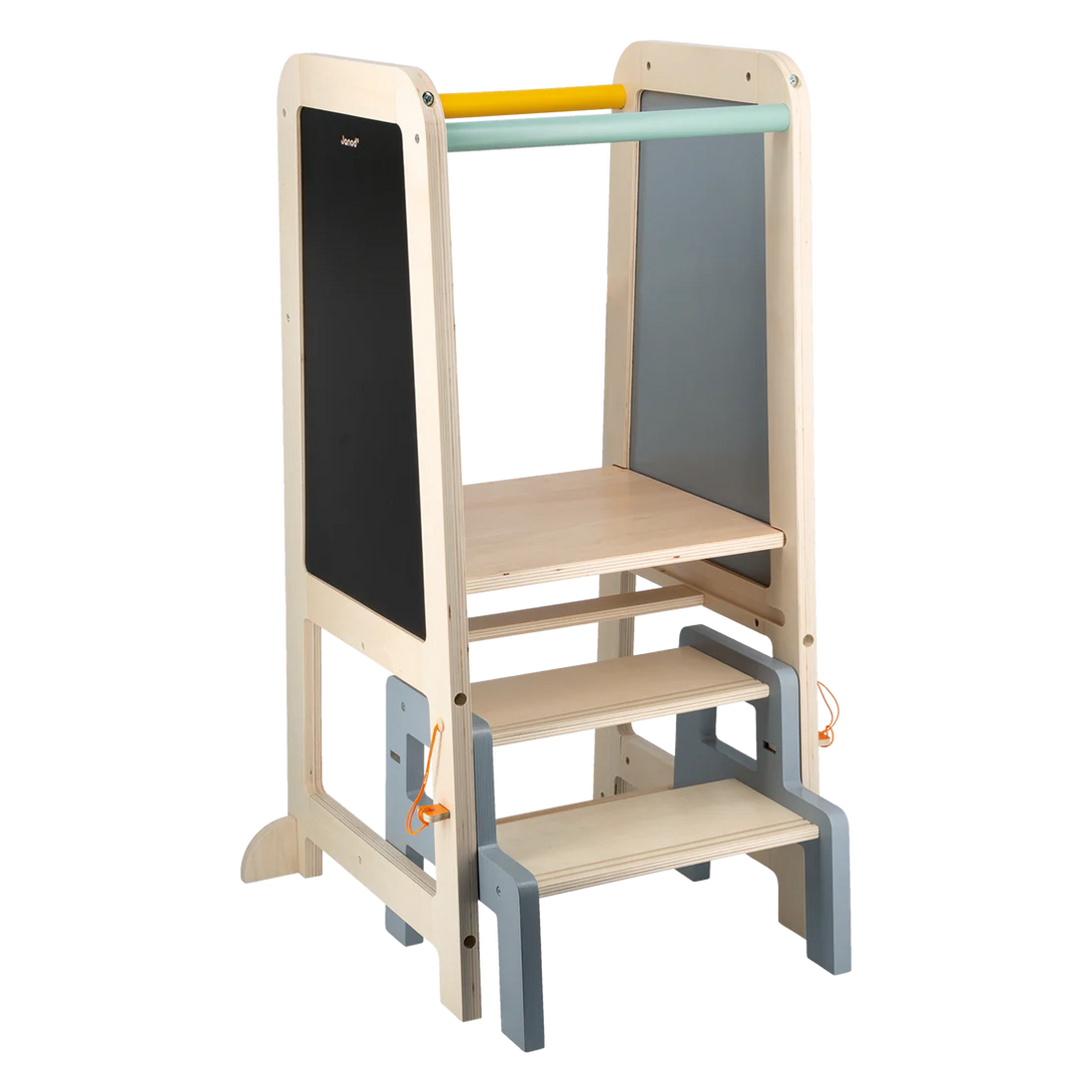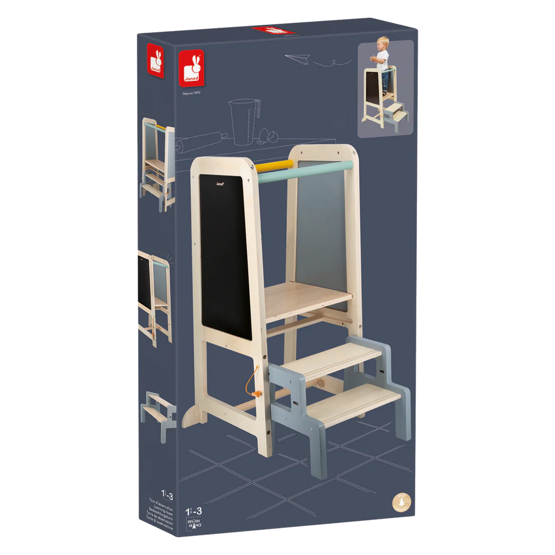 Discovering the world of adults!! This pretty wooden observation tower will allow your child to climb up to your height for all daily activities: in the kitchen, in front of the sink... and allow him to more easily develop his fine motor skills, his autonomy and his interaction. with the others. The tower grows with your child thanks to 2 levels allowing height adjustment (from 32.5 to 40.5 cm). It is also very accessible thanks to its removable stool that serves as a step. It can be attached to the tower for added security with two keys, and easily detached for carrying around the house. Beyond its practical side, the tower also has a playful side thanks to the blackboard located on the side which offers great playability, to draw or write new recipes! Comes with 2 chalks and a brush. For children from 18 months.