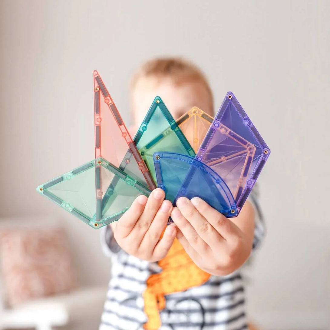 With a series of exclusive shapes, including large triangles, right-angled triangles, quarter circles, pentagons, trapezoids and rhombuses, this pack expands the possibilities for magnetic design and play.